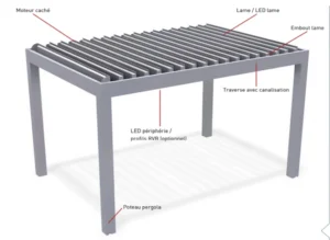La pergola bioclimatique est équipée de lames orientables motorisées, qui vous permettent d’ajuster l’ouverture du toit selon l’ensoleillement, la température ou le vent. Résultat : un confort thermique sur-mesure et une utilisation optimale de votre terrasse toute l’année.